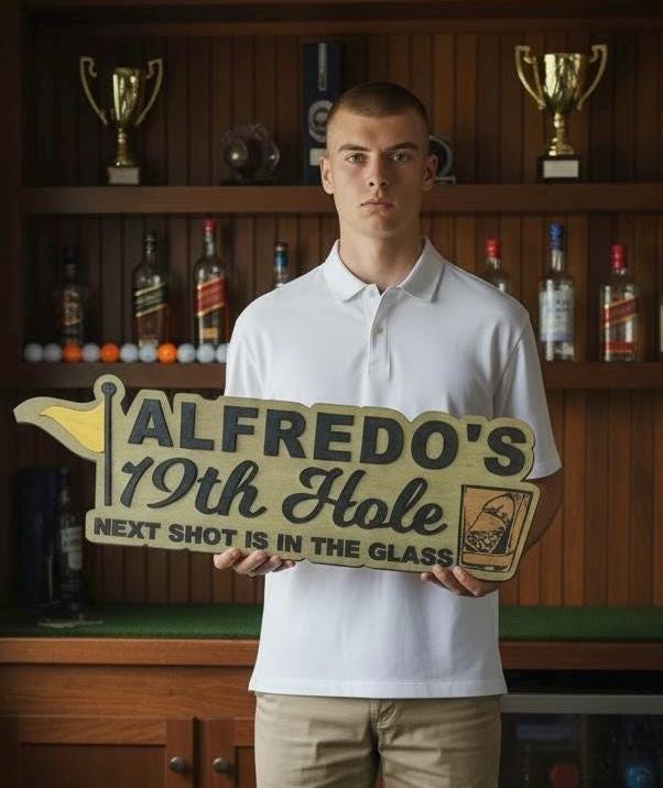 Elevate your man cave or home bar with our Personalized 19th Hole Bar Sign! Crafted from real wood, this custom golf decor adds a unique touch to any space. Available in various colors and sizes, it’s the perfect gift for any golfer looking to enhance their bar area. Celebrate the love of the game with this stylish and functional wall sign. Make your bar truly yours with a custom design that showcases your passion for golf! Order now and enjoy a personalized piece that’s sure to impress!