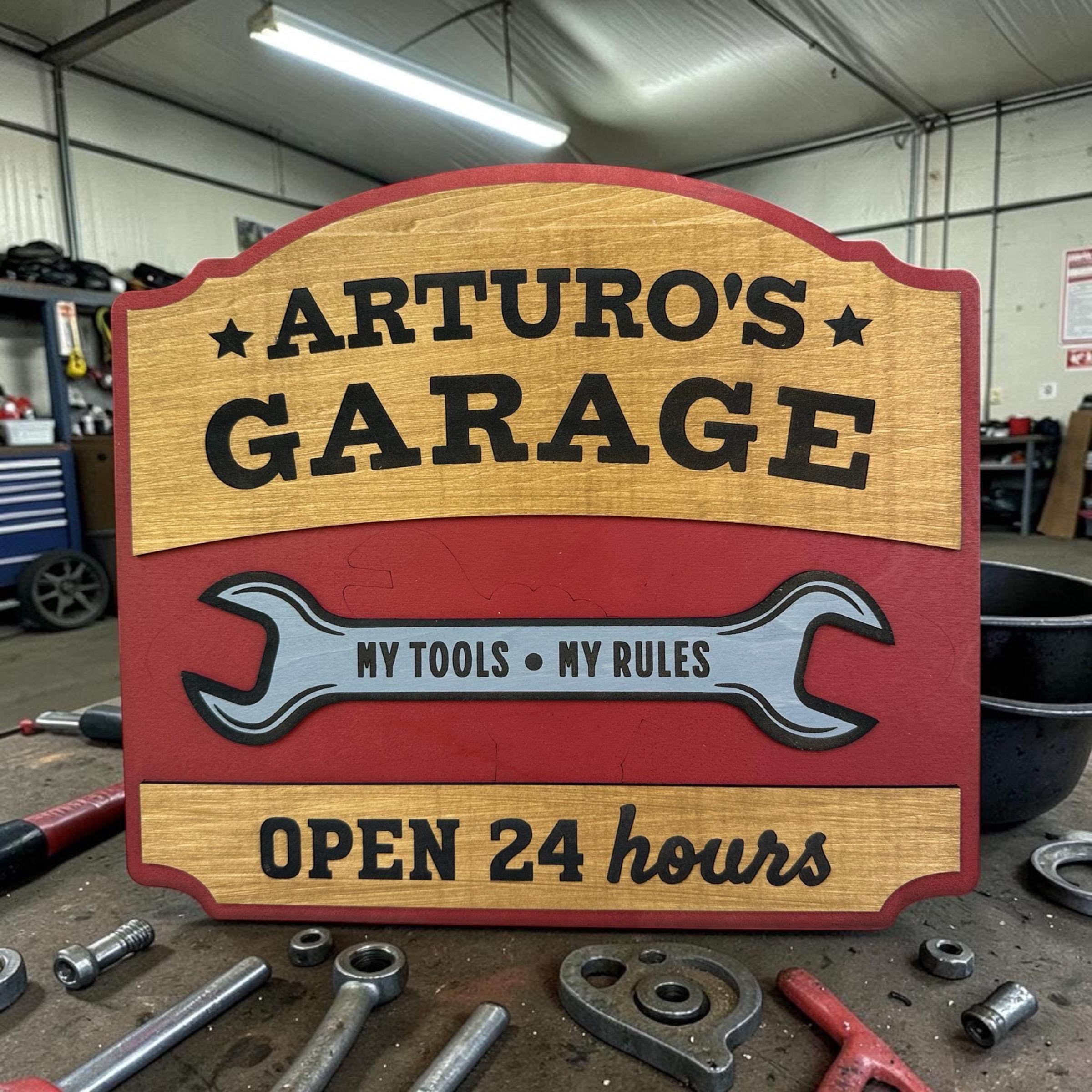 Transform your garage or workshop with our handcrafted real wood sign! Perfectly tailored to reflect your personal style, each sign is customizable with your choice of text, stain color, and size. Whether you want to display your name, a special phrase, or a clever slogan, our signs are designed to add a unique touch to your space. Made from high-quality wood, these signs are durable and crafted with care. Elevate your workspace today with a personalized sign that’s truly one-of-a-kind!